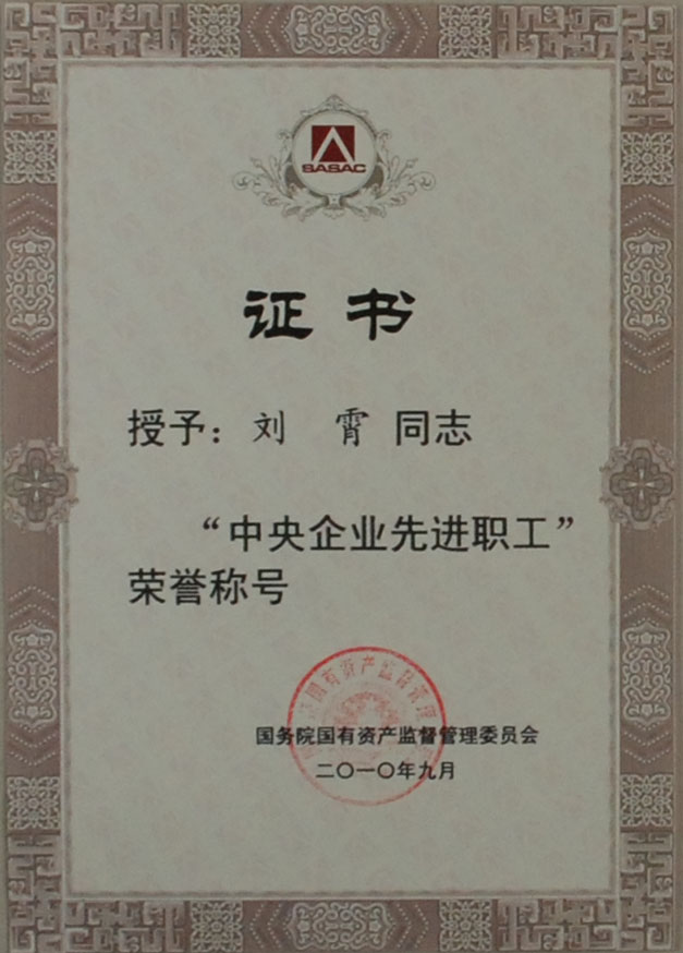 劉霄同志先后經公司、集團兩級工會推薦,國務院國資委專門評審領導小組評審,最終獲評“中央企業先進職工”。