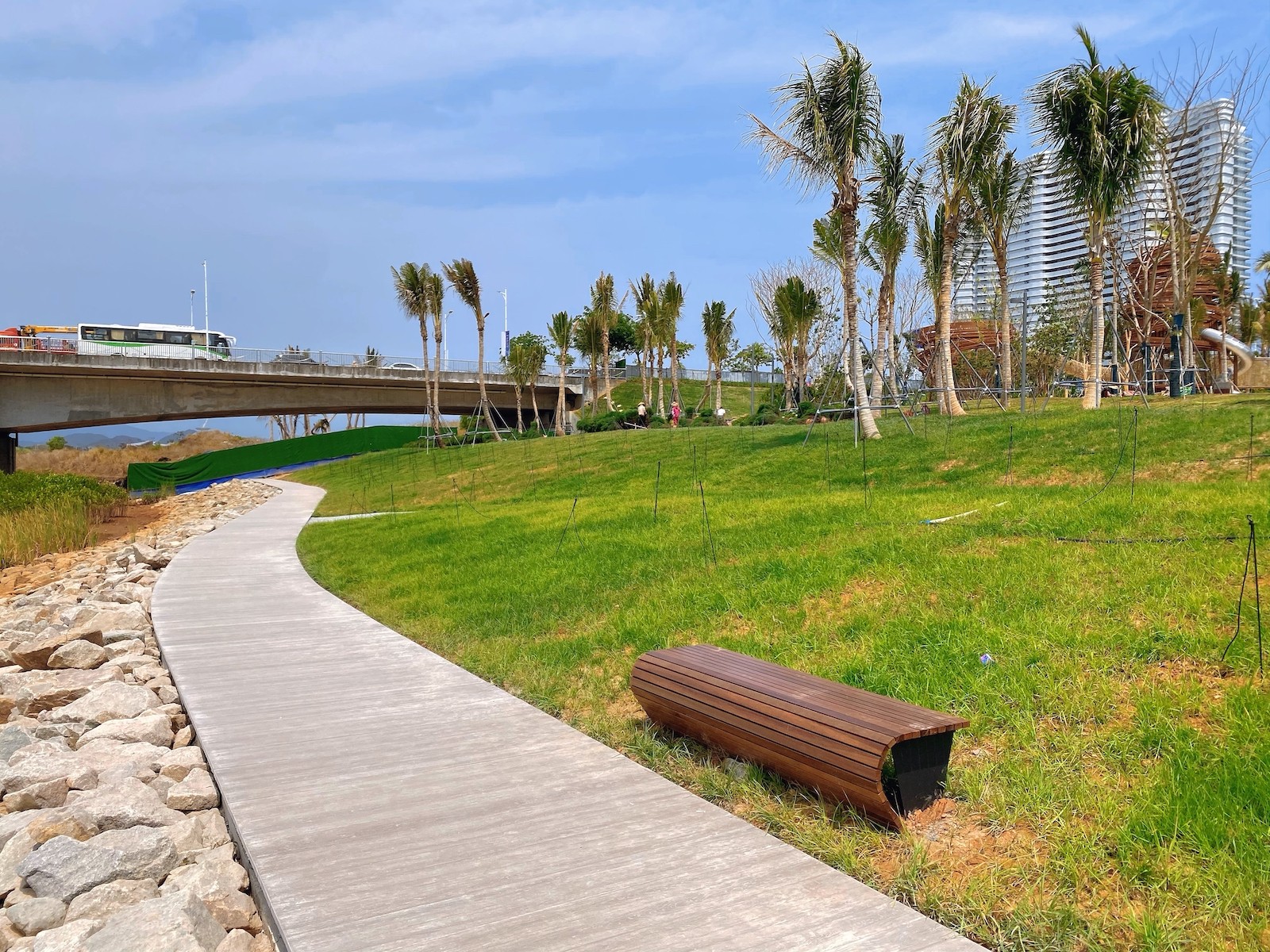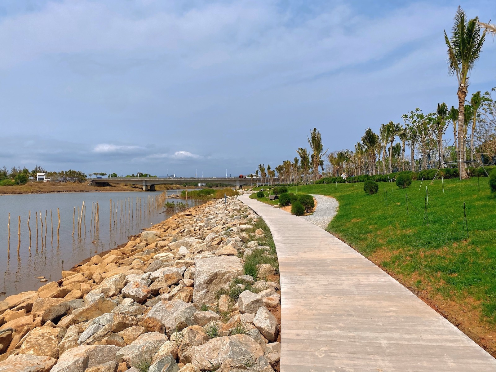 The Sanya Haitang River Comprehensive Treatment Project Start-up Area Project is an important milestone in Sanya's green development strategy. Among them, the sample project of the trestle along the river is built by Sinoma Energy Conservation (Wuhan) Co. (hereinafter referred to as "Energy Saving Wuhan"). Energy Saving Wuhan practices the corporate mission of "materials create a better world", actively responds to and promotes the ecological management of the whole area of the river, and chooses the self-developed and self-researched and self-produced Sinoma Hankun? palisade boards, so as to integrate the green space along the river, enhance the vitality of natural ecology with the green environmental protection products, harmonize the landscape and the environment, and contribute to the health and sustainable development of the city. We will contribute to the health and sustainable development of the city. Sinoma Hankun? pallet board is a new type of green board with natural cedar texture on the surface, integrating green environmental protection, Class A fire prevention, moisture and moth proofing, convenient installation and other excellent properties; as the best alternative to wood materials and wood-plastic products, it has better weather resistance and economy, and has been used as the best alternative to wood and plastic products. As the best alternative to wood and wood-plastic products, it has better weather resistance and economy, and has been widely used in landscape projects.